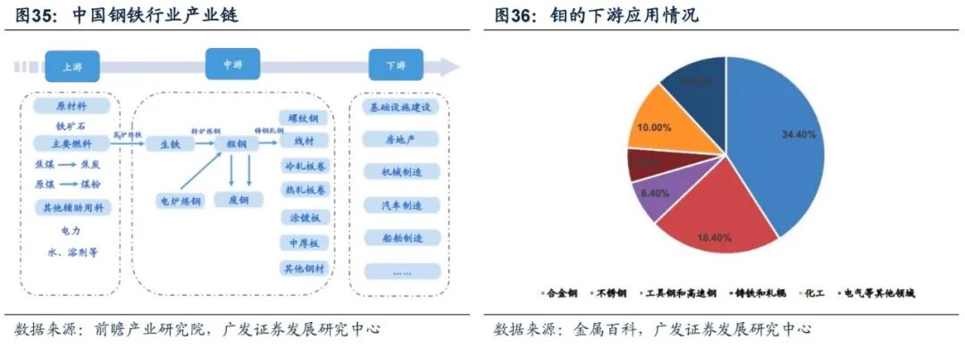 钢铁行业的主要产品工程合金钢、不锈钢的上游原材料包括铁矿石、钼、钨铁、锰。从需求端看,根据前瞻产业研究院,原材料占钢铁行业成本的七八成,铁矿石占钢铁成本的40%~55%。钨铁是生产特殊钢最重要的合金元素之一,锰对炼铁有改善冶炼加工和生铁性能的作用,对炼钢有脱氧、脱硫和作为合金元素的作用。从供给端看,根据金属百科,钼主要应用于钢铁工业(约占80%),用于生产合金钢、不锈钢等;全球每年生产的约90%的锰被用于钢铁工业。从战略意义看,钢铁工业是国民经济的重要基础产业,是建设现代化强国的重要支撑,也是实现绿色低碳发展的重要领域。国家发改委等四部门《高耗能行业重点领域节能降碳改造升级实施指南(2022年版)》等政策文件均对钢铁行业的节能降碳提出目标。我们在第一章曾提到我国钼因主要项目停工导致产能不确定性提升,铁、钨铁、锰依赖进口,因此需要重点关注钢铁环节。