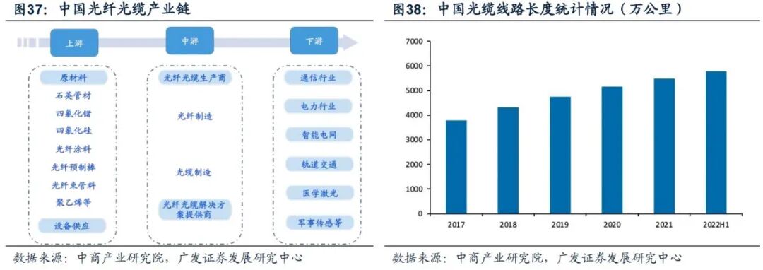 光纤通信工程化应用依赖锗。从需求端看,锗作用关键且光纤光缆需求提升。掺锗光纤具有容量大、光损小、色散低、传输距离长及不受环境干扰等特性,是目前唯一可以工程化应用的光纤,是光通讯网络的主体。根据中商产业研究院,国家网络建设和数字经济的发展将带动光纤光缆的市场需求,截至2022年6月,全国光缆线路总长度达5,791公里,同比增长8.2%。从供给端看,根据中研网,锗下游光纤占比最大,约30%,其次是红外、催化剂等。从战略意义看,光纤通信对实现我国“十四五”数字经济发展规划至关重要,对于信息网络基础设施优化,规划指出要推进光纤网络扩容提速,实现城市地区和重点乡镇千兆光纤网络全面覆盖。我们在第一章曾提到我国锗因储量控制产能不确定性提升,因此需要重点关注通信环节。三、风险提示