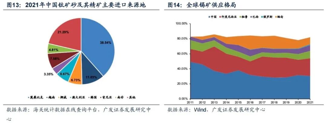 钛:钛原料对外依存度在40%左右,主要从非洲国家进口从对外依存度看,根据中国有色网和海关统计数据,2021年我国钛原料对外依存度在40%左右,钛精矿对外依存度在55%左右。从主要进口来源看,2021年我国钛矿砂及其精矿进口国中非洲国家占比较高,莫桑比克占比最大(38.54%)。非洲地区与中国关系相对较好,但气候变化、国内政治不确定性等对供应的不利因素相对较多。若西方国家澳大利亚、挪威等与中国关系恶化,在整体进口上或面临一定压力。锡:高度依赖缅甸,锡精矿对外依存度在66.90%以上从对外依存度看,根据中国有色金属工业协会锡业分会、USGS、海关统计数据,2021年我国锡精矿进口实物量达18.4万吨,出口量为0,锡矿产量达9.1万公吨,由此可推算锡精矿对外依存度在66.90%以上。从主要进口来源看,2022年上半年我国锡精矿主要进口来源国前三依次为缅甸、刚果(金)、澳大利亚,其中,从缅甸进口的数量占进口总数的74.63%。从全球产储情况看,根据USGS,2021年全球锡矿产量为30万公吨,其中中国、印尼产量占比最大,分别为30.33%和23.67%。同时,中国储量占比最大(为22.45%),其次为印尼和缅甸,占比分别为16.33%和14.29%。锑:锑精矿依赖澳大利亚、俄罗斯等,对外依存度超35%我国锑资源最主要的矿物原料为锑矿。从主要进口来源看,根据华经产业研究院,2021年我国锑精矿进口量总计3.39万吨,出口量为0.5万吨,主要进口国为澳大利亚、俄罗斯和塔吉克斯坦,分别占比26.2%、25.1%、23.5%。从对外依存度看,根据USGS,我国锑矿产量为6万公吨,占世界比重为54.55%,由此推算对外依存度大于35.76%。铌:铌铁高度依赖巴西,对外依存度在96.65%以上根据金属百科,世界约85%~90%的铌以铌铁形式用于钢铁生产。从主要进口来源看,根据海关统计数据,2021年我国铌铁进口量约4.05万吨,其中95.78%来自巴西,4.09%来自加拿大,2021年我国铌铁出口量约116吨。从全球产储情况看,根据USGS,2021年全球铌矿产量7.5万公吨,巴西占比88.00%,加拿大占比9.87%,其他国家产量为0.14万吨。从对外依存度看,结合我国铌铁进出口量可推算我国铌铁对外依存度大于96.65%。铀:依赖哈萨克斯坦和纳米比亚,对外依存度常年维持在70%以上从对外依存度看,根据中研网,我国铀资源对外依存度常年维持在70%以上。从主要进口来源看,根据海关统计数据,2021年我国从纳米比亚进口铀矿砂及其精矿达13,964千克,进口天然铀及其化合物、合金、分散体等共13,535吨,其中从哈萨克斯坦进口占比47.72%,从纳米比亚进口占比36.86%。![]()