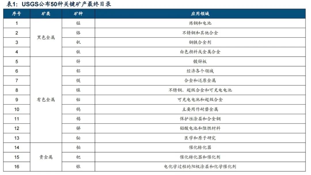 我们在2022.10.21《策略联合行业:新时代“国家安全”主线》中指出,国家安全“自上而下”战略升级,资源安全是保障国家经济安全、国防安全和战略性新兴产业发展需求的重要对象,资源安全主要涉及两大方向,即矿产资源安全和能源资源安全。在矿产资源安全上,2016年国土资源部、发改委、工信部、财政部、环境保护部和商务部共同发布《全国矿产资源规划(2016-2020年)》,2022年美国地质调查局(USGS)公布了50种对于经济和国家安全极为重要的关键矿产的最终目录,在国家安全、经济、可再生能源发展和基础设施建设发挥着重要作用;在能源资源安全上,随着“双碳”目标的推动,我国面临能源保供与能源转型的双重目标,总体来看,矿产和能源资源是整个国家经济建设的上游原材料,保障资源供应即是保障了国家发展的命脉。