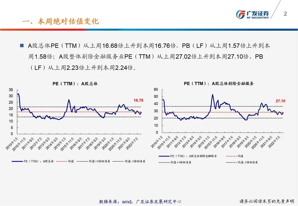 (1)A股总体PE(TTM)从上周16.68倍上升到本周16.76倍,PB(LF)从上周1.57倍上升到本周1.58倍;A股整体剔除金融服务业PE(TTM)从上周27.02倍上升到本周27.10倍,PB(LF)从上周2.23倍上升到本周2.24倍。