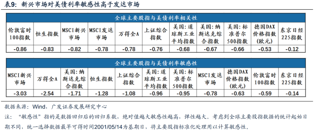 从具体各国股指对美债利率的敏感性来看,新兴市场对美债利率的敏感性普遍高于发达市场。从标准化处理后的数据来看,MSCI新兴市场、万得全A、上证综合指数及恒生指数对美债利率敏感性均高于主要发达国家股指对美债利率敏感性,分别为 -3.02, -2.54, -1.08,-1.04;意味着美债利率下行时期,新兴国家的金融条件改善对于股票市场估值的拔升作用更强。