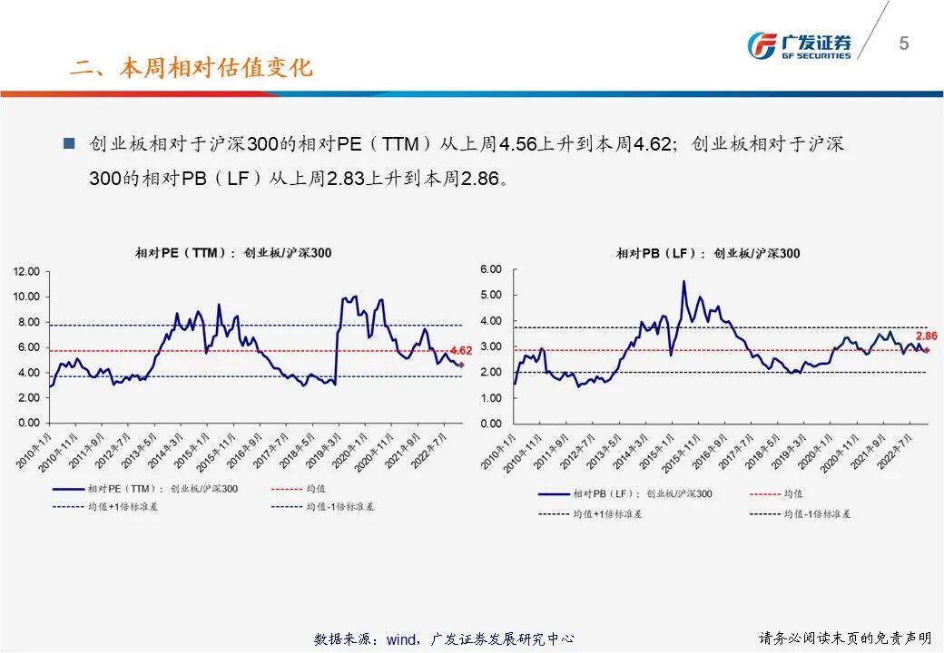 (5)创业板相对于沪深300的相对PE(TTM)从上周4.56上升到本周4.62;创业板相对于沪深300的相对PB(LF)从上周2.83上升到本周2.86。