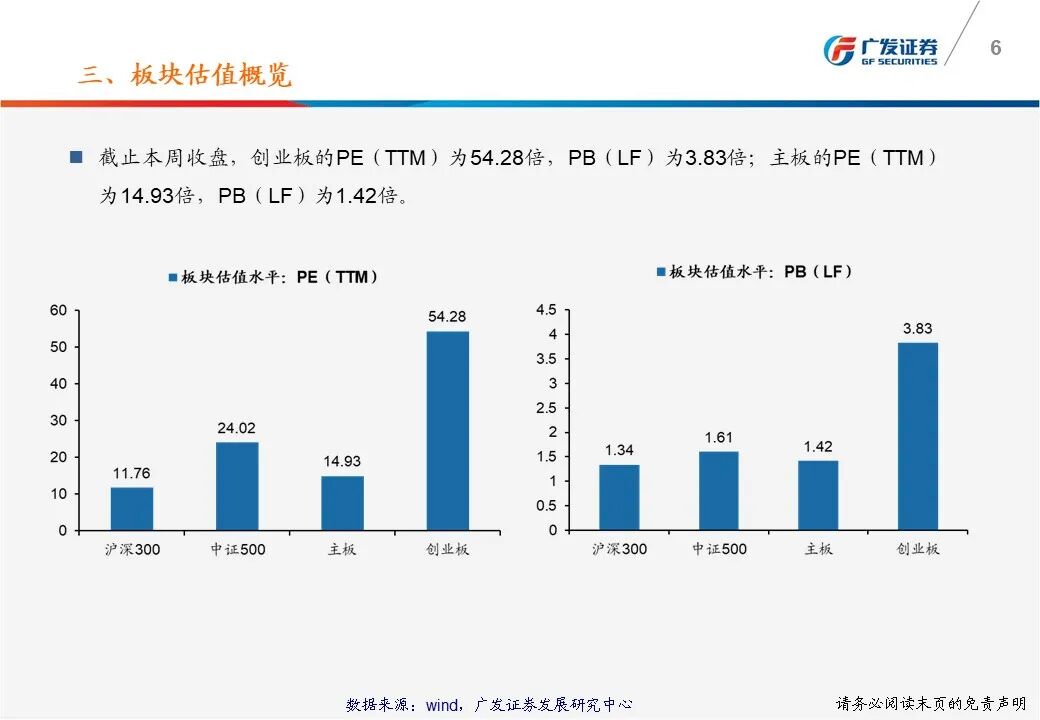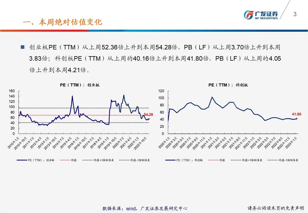 (2)创业板PE(TTM)从上周52.36倍上升到本周54.28倍,PB(LF)从上周3.70倍上升到本周3.83倍;科创板PE(TTM)从上周的40.16倍上升到本周41.80倍,PB(LF)从上周的4.05倍上升到本周4.21倍。