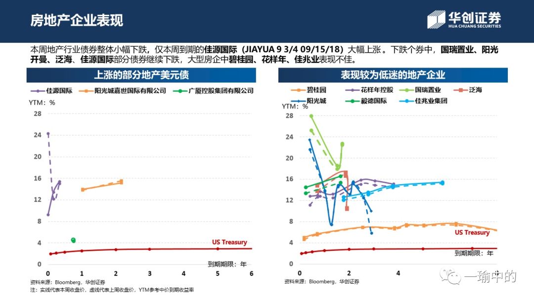 地产企业中,本周仅有佳源国际到期债券(JIAYUA 9 3/4 09/15/18)大幅上涨,国瑞置业(GUOPRO),阳光开曼(YAINVE)、泛海(FANHAI)继续下跌走势,花样年(FTHDGR)、毅德国际(HYDOO)本周亦表现不佳。城投债券中,本周青海省投(QHINVG)、江苏系债券调整下跌。工业类企业中,兴业太阳能(CSSXF)本周终于回调上涨。