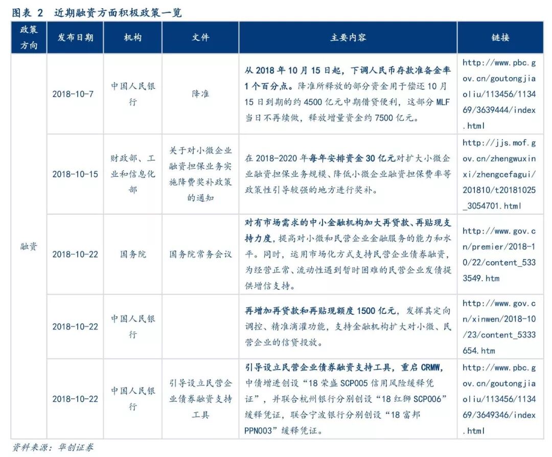 四季度来,针对内外困局,积极政策密集出台,基调由破转立,重点在于立信心、立金融、立经济。立信心——积极回应市场的疑虑和关切,习近平主席在最近的考察和会议中表示民营经济在整个经济体系中具有重要地位,所有民营企业和民营企业家完全可以吃下定心丸、安心谋发展。立金融——一方面以降准、再贷款再贴现、民营企业债券融资支持工具等扩大信贷投放,一方面鼓励银行理财资金、私募股权资金、保险资金入市。立经济——从减税降费、消费、基建等方面着力刺激需求。