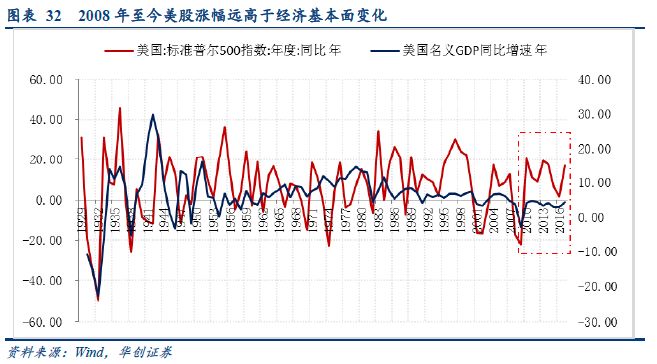 长期维度:50年维度看相对经济的估值—美股涨幅远高于经济基本面变化。宏观经济和企业盈利是影响股市的核心因素,美国的股市自1930年至2006年可以较好地能反映经济基本面的变化,但近十年美股的涨幅已经远远高于GDP增速(1930-2006年GDP平均增速为6.94%,标普涨幅为6.62%, 两者仅相差0.31%。而2008-2017年年间,GDP平均增速为3.17%,标普涨幅为6.25%,标普涨幅超跑GDP增速一倍左右,从这个角度看,最近十年标普相对经济增速累积较高的泡沫)。
