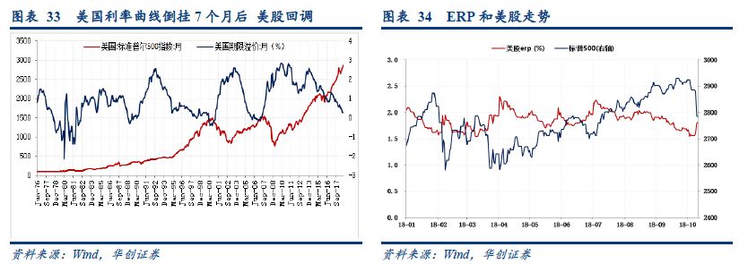 中期维度:看期限溢价的逼近——本轮周期的牛市尾声接近。由于美股涨幅远高于其经济基本面变化,因此美股积攒了一定的调整压力,利率曲线倒挂是美股调整的前瞻指标(利率曲线倒挂成功预测了美国2000年和2007年的股灾,在利率曲线倒挂平均7个月后,倒挂30-50bp左右,美股出现拐点),当下美国的十年期和两年期的期限利差已达到金融危机以来低点,仅剩20bp左右。