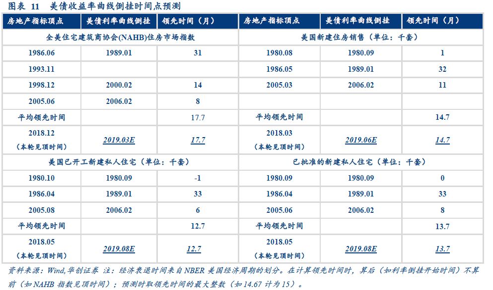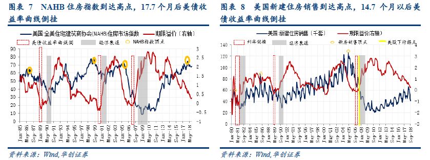 美债利率曲线倒挂时间点预测:2019 Q2前后。美国房地产市场是美国收益率曲线利率倒挂的前瞻指标(平均来看,房地产指标领先美债收益率曲线倒挂14.67个月),目前房地产市场高点已现,正在进入下行周期。在众多房地产领先指标中有四个指标时间序列最长也最有代表性,分别是全美住宅建筑商协会(NAHB)住房市场指数、美国新建住房销售、已开工的新建私人住宅和已批准的新建私人住宅。目前以上四个指标分别于2017年12月、2018年3月、2018年5月出现周期高点。根据历次房地产市场指标见顶领先收益率曲线倒挂的规律估算,美债利率曲线倒挂或会在2019年Q2前后出现。