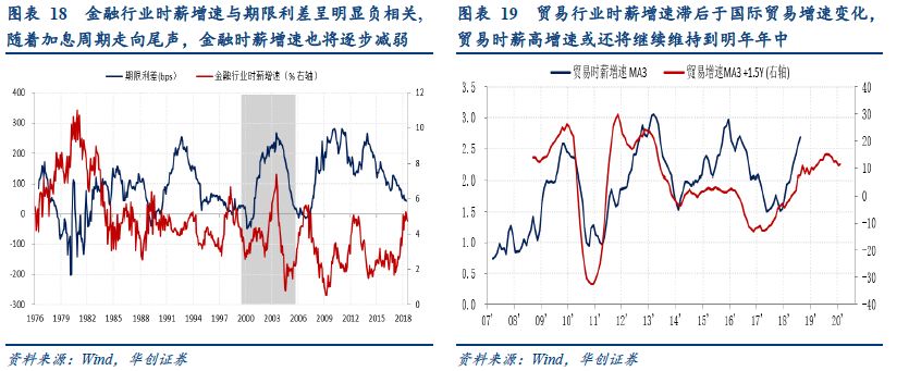 短期来看,通胀保持温和:内部影响因素—薪金增速来看,此轮时薪增速的上涨或持续至明年一季度,年内将触及3%并维持在该水平,随后明年二季度增速减缓。从行业来看,2018年整体时薪增速显著提升,背后主要是金融行业和贸易行业时薪增速高增带来的。展望未来,金融行业的时薪高增长(与期限利差负相关)或持续高位,直至2019年二季度会渐显颓势,同时贸易行业时薪增速(滞后于全球贸易增速)也将继续提升至明年年中,另外专业和商业服务(跟随消费增速变化)亦会停留在较高位置。从基础项看,制造业、一般服务业两大基础行业当前时薪增速较低,滞后于人均GDP和消费支出变化,未来或有小幅提升,拖累作用会有所减弱,不至于在边际上减缓整体薪资增速。综合判断,随着主要拉动行业(金融、贸易)时薪增速二季度减速,以及基础行业(制造业、一般服务业)的温和回升,明年二季度开始美国整体时薪增速逐步从高位小幅回落。外部冲击来看,贸易战对美国通胀影响也相对可控。征收关税对PCE的影响仅在0.1%-0.3%之间。详细观点请见《【华创宏观】美国输入型通胀知多少?对加息节奏与期限溢价的影响—华创宏观·穿越迷雾三》