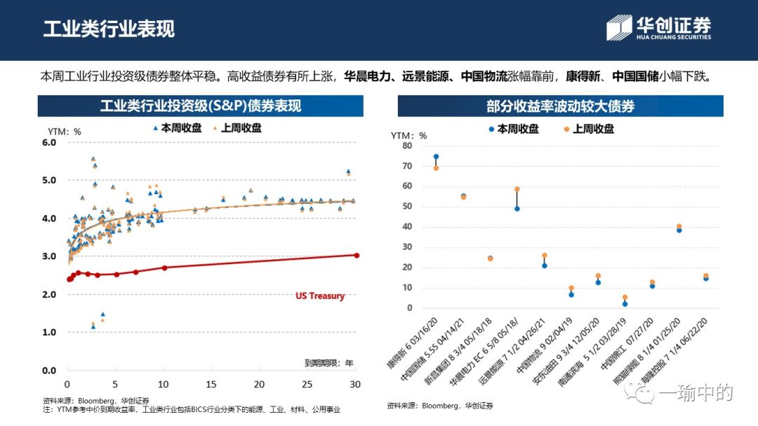 金融服务业本周投资级表现平稳,高收益债券中,同创九鼎(JIUDGR)、山东高速(HERINT)涨幅靠前。工业类企业中华晨电力(HCELEC)、远景能源(ENVENE)、中国物流(CNLOGI)强势上涨。