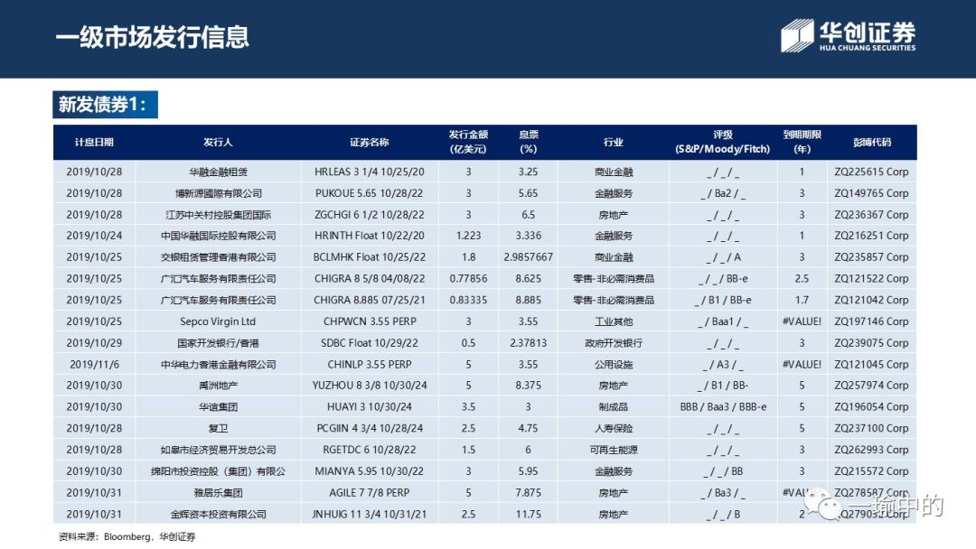 具体内容详见华创证券研究所10月27日发布的报告《【华创宏观】投资级震荡,高收益地产重启上涨——中资美元债周报20191027》。
