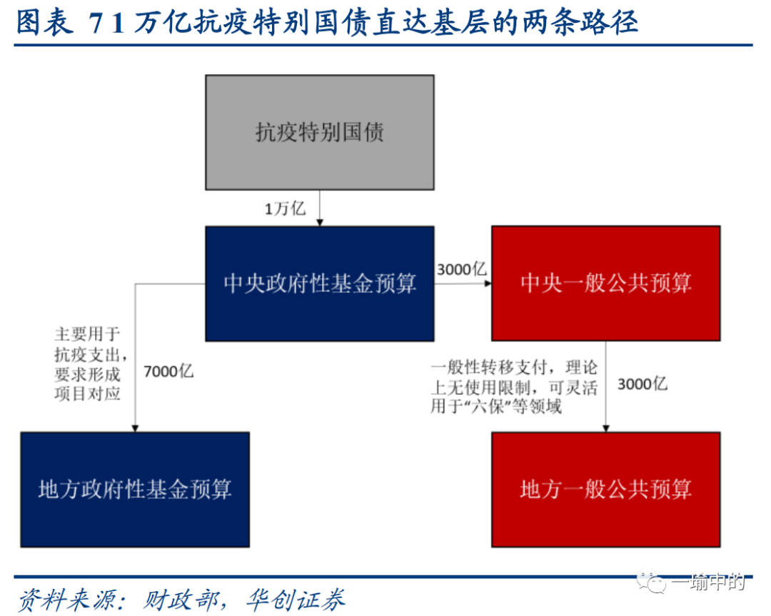 中央财政预算从二本账调入3002.5亿(去年仅调入4.23亿),主要增量来自抗疫特别国债发行收入。根据预算草案,今年发行的1万亿抗疫特别国债要求全部直达市县基层,主要用于地方公共卫生等基础设施建设和抗疫相关支出,并预留部分资金用于地方解决基层特殊困难。从特别国债注入的中央二本账出发,分为两条路径:约7000亿直接在二本账内对地方转移支付,这部分资金主要用于抗疫相关支出,要求形成项目对应。剩余约3000亿先调入中央一本账,再通过一般性转移支付进入地方一本账,地方理论上没有使用限制,可灵活用于“六保”等领域。