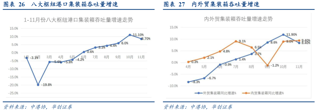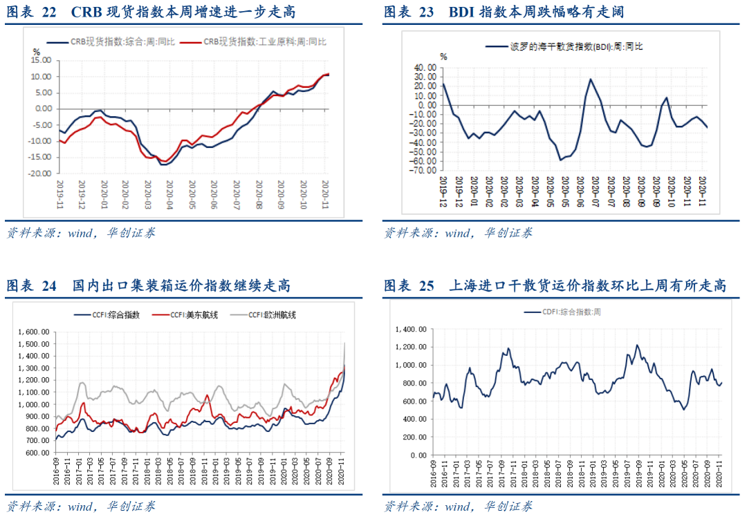 (六)出口:11月集装箱外贸吞吐量环比10月略有回落本周CRB现货指数同比+10.4%,工业原料价格指数同比+11.1%,增速与上周大致持平;BDI指数同比-23.8%,本周跌幅进一步走阔;本周国内出口集装箱运价指数大幅提升,综合指数、美东航线指数、欧洲航线指数同比增速分别录得60.9%、51.2%、55.1%;上海进口干散货运价指数环比增速再度回落,同比增速-21.11%。根据中港协数据,11月下旬八大枢纽港口集装箱吞吐量同比+3.7%,较前值回落5个百分点,其中外贸集装箱吞吐量同比增长+3.8%。大宗商品方面,11月下旬重点港口原油吞吐量同比-3.5%,较中旬增加3.1%,重点港口金属矿石吞吐量同比+16.1%,增速大幅提升。近期美线运价持续高位,欧地线因货源明显增加市场运价同比也大幅上涨,远洋航线舱位及货箱短缺的情况较为突出。11月整月来看,八大枢纽港口集装箱吞吐量同比增长8.7%,增速较10月份回落2.4个百分点。其中,外贸增长8.4%,较10月份回落3.5个百分点,1-11月份八大枢纽港口累计集装箱吞吐量恢复至去年同期水平。![]()