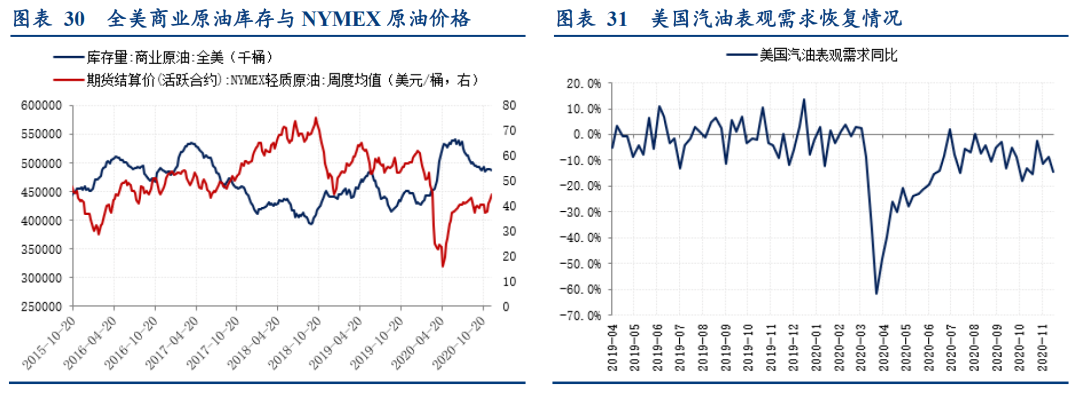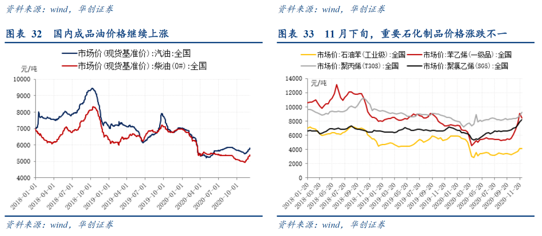 本周召开的OPEC+会议达成协议:自2021年1月开始,成员国决定自愿将减产数自770万桶/日调整至720万桶/日,从2021年1月起,每月召开会议评估市场状况并决定每月的产量调整,每月调整幅度不超过50万桶/日,减产幅度略不及市场预期(市场预期将770万桶/日的减产量延长至明年3月底)。国际油价继续保持上涨趋势,截至本周,油价已连续上涨五周。本周四,IPE布油期货结算价收于48.82美元/桶,环比上周上涨1.14%;本周五,WTI原油期货结算价收于46.26美元/桶,环比上周上涨1.6%。上周,全美商业原油库存环比小幅减少,美国汽油表观需求依旧疲软。美国原油库存情况,11月27日当周,全美商业原油库存环比减少约67.9万桶,环比小幅下降0.1%。美国成品油需求恢复情况,11月27日当周,美国汽油表观需求约808.53万桶/周,环比上周减少5.3%,同比去年下降14.5%。本周国内成品油价格持续上涨,11月下旬重要石化制品价格涨跌不一。国内成品油方面,本周五,国内汽油价格收于5810元/吨,环比上周上涨1.5%;柴油价格收于5391元/吨,环比上周上涨1.6%。其他石化制品方面,11月下旬,石油苯、苯乙烯价格分别环比下跌1.6%、7.7%,聚丙烯和聚氯乙烯价格持续上涨,分别录得5.7%和4.3%的环比涨幅。![]()