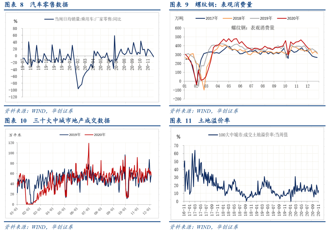 生产端,水泥价格继续上行。12月4日当周,全国水泥价格指数上涨0.1%,华东区域小幅回落,中南、西南区域分别上涨0.5%、0.4%。螺纹产量维持低位。近9周基本都是360万吨左右。库存方面,本周去库进一步放缓,本周螺纹钢去库8万吨,上周去库37万吨。价格方面,螺纹钢HRB400 20mm上海12月4日价格为4010元/吨,11月27日为4130元/吨,11月20日为4250元/吨。汽车批发数据,11月30日当周同比为4%,11月22日当周为14%,以周度数据计算的月度同比看,11月截止至30日为8.8%,10月为8.5%,9月为9.2%,8月为5.9%。![]()