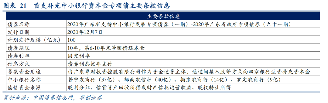 (五)地方债:首支补充中小银行资本金专项债落地,广东百亿注资四银行根据中国债券信息网,首支补充中小银行资本金专项债将在12月7日由广东发行,计划发行总额100亿,发行期限10年(第6-10年末等额偿还本金,前5年只偿利息),由广东粤财投资控股有限公司作为资金运营主体,通过间接入股等方式分别向普宁农商行、郁南农信社(拟改制组建为郁南农商银行)、揭东农商行和罗定农商行注资补充资本金37亿、40亿、14亿和9亿。偿债资金来源于股利分红、信贷资产回收所得或财产信托运营收益、股权转让所得。以注资普宁农商行为例,据广东省财政厅提供资料,本期债券存续期内,粤财控股可获得股利分红合计0.51亿元、信贷资产收回所得合计56亿元、股权转让所得合计3.63亿元,合计可获得偿债资金60.14亿元,对本期债券本息的覆盖倍数为1.25倍(后三家本息覆盖倍数分别为1.18倍、1.43倍、1.16倍)。![]()