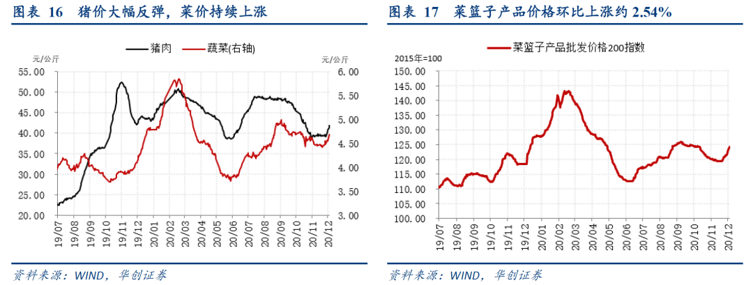 传统的消费旺季临近,在腌腊需求的带动下,终端消费改善带动猪肉价格反弹。截至12月6日,菜篮子价格200指数收于124.38,较上周环比上涨2.54%。冬季供给减少,蔬菜和水果价格持上涨,本周蔬菜价格环比大涨4.23%,水果价格环比上涨1.38%。蔬菜和水果或以开启季节性上涨,蔬菜价格已连续两周上涨,水果价格已连续五周上涨。本周,猪肉价格环比大涨6.88%,主要动力是需求端的改善,消费旺季来临,尤其是南方地区的腌腊需求带动猪价反弹。此外,进入冬季后,需要注意潜在的猪瘟疫情复发再次干扰生猪产能。此前农业农村部曾表示:随着秋冬季气温降低,清洗消毒效果可能会受到影响,加上种猪、仔猪调运频繁,疫情发生和传播的风险进一步增大,如果防疫措施落实不到位,不排除出现区域流行的情况,影响甚至阻断生猪生产加快恢复的进程。![]()