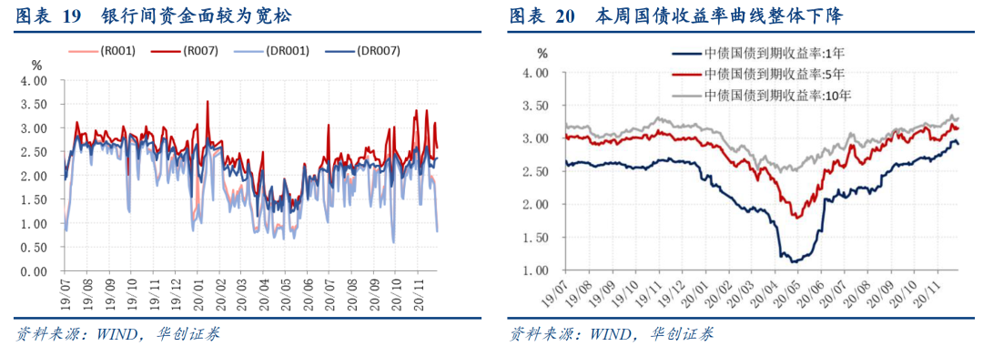 截至本周五DR007收于2.0372%,DR001收于1.0786 %,环比分别变化-33.04bps、+26.08bps。1年期、5年期、10年期国债收益率分别报2.8708%、3.1156%、3.2651%,较上周五分别变化-3.96bps、-3.66bps、-3.49bps。本周央行公开市场操作净回收3300亿资金,但央行前期持续的资金投放,特别是本周一例外的MLF操作依然向市场释放了积极的信号,流动性短期内大概率依然维持比较宽松的环境,银行间DR007较上周进一步回落,只是隔夜利率有小幅抬升回到1%以上。与此同时,虽然周一公布的PMI数据反映经济修复势头强劲,但本周大宗商品快速上涨的速度有所放缓,给市场缓和了一些压力。但我们认为这些利好因素的持续性有限。就货币政策来看,上周五央行发布研究论文《拓展通货膨胀的概念与度量》暗批海外央行无止境的量化宽松,实际上再次重申了坚决不“大水漫灌”的态度,本周银监会发布《中国影子银行报告》再提影子银行治理,也反映监管将进一步收紧。另外,国内经济修复的趋势并没有改变,并且伴随明年海外财政刺激和疫苗接种的落地,大宗商品价格仍将抬升。![]()