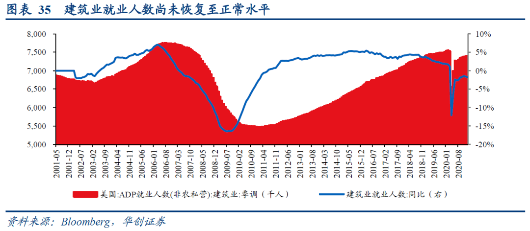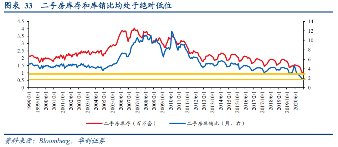 3)库:美国住宅库存低不低?库销比如何?库存低:目前美国住宅库存低、库销比也处于低位。目前新建独栋住宅待售量为30.8万套,库存水平在近60年历史中处于30-40%分位;但库销比处于近60年历史低位,库存仅能支撑4.6个月的销售。二手房库存约为104万套,二手房库销比为1.9个月,两者均处于30年来绝对低位。住宅供给或仍然偏紧:处于70年历史低位的自有住宅空置率(目前为1%)指征着住房供给非常短缺;此外建筑业就业人数仍尚未恢复至疫情前水平(较疫情前下降1.8%左右),即使美国疫苗接种符合市场预期,建筑业就业人数在今年逐渐恢复,但还不足以对库存构成累库压力,相对于火热的销售,住宅供给或仍然偏紧。