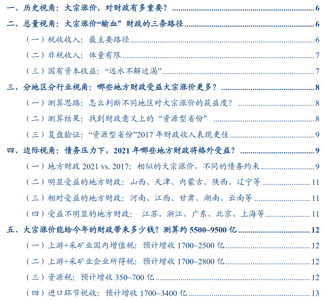 非税收入占我国财政收入不到2成(2020年2.85万亿),其中大宗贡献部分极其有限。非税收入中,大宗贡献部分主要是占比约四分之一的专项收入(2020年0.71万亿)中,随增值税“水涨船高”的教育附加收入——假设专项收入全年维持上半年近30%的高增、且增量全部来自增值税相关教育附加收入,按国内增值税中与大宗涨价直接相关的上游+采矿业贡献(15%)估算,大宗贡献非税收入体量也仅约0.71*30%*15%=320亿,占财政收入不到0.2%。大宗涨价影响非金融国企利润,但无关当年国有资本收益。非金融国企上缴财政,除缴税费外,主要是缴国有资本收益。国有资本收益主要包括应交利润和国有股股利[3],先缴入国有资本经营预算,再调出补充一般公共预算。虽然今年前五月国有企业利润总额17939.3亿元,同比增长1.7倍,两年平均增长13.5%,但现行规定下,国有资本经营预算收入主要根据上年实现净利润一定比例收取[4],当年国有资本收益和当年大宗涨价无关。总的来看,大宗涨价“输血”财政的三条路径中,税收收入是最主要路径,非税收入体量有限,国有资本收益和当年利润无关。下文中,我们就税收收入进一步展开。(一)测算思路:怎么判断不同地区对大宗涨价的获益度?明确了大宗涨价对财政的重要性和总量传导路径后,我们更关心其对地方财政的影响。需要注意的是,我国现行税制下,进口环节税收全归中央,在评估分地区影响时需要剔除,我们主要考察国内增值税(下称增值税)、企业所得税、资源税三个大宗价格直接相关税种。进一步分行业看,大宗涨价主要提升上游原材料企业盈利能力,我们主要考察41个工业大类中,上游制造业+采矿业贡献的增值税和企业所得税。基于以上两个维度,计算各地区上游+采矿业增值税、上游+采矿业企业所得税、资源税在税收收入中的合计占比(以下简称大宗税收占比)。占比越高,倾向于当地财政越受益于大宗涨价。按上述测算思路,明确测算口径:对于上游+采矿业企业所得税,采用《中国税务年鉴2020》中的全国企业所得税分地区分行业收入;对于资源税,基本以采矿业为主,直接采用《中国税务年鉴2020》中的分地区收入;对于上游+采矿业增值税,由于税务年鉴不公布分地区分行业收入,我们以《中国工业统计年鉴2020》中的分地区分行业营业收入占比作为分地区分行业增值税占比的替代,再乘以同年税务年鉴公布的对应行业增值税收入,得到分地区分行业增值税的估算值。按上述口径,我们测算各地区上游+采矿业增值税、上游+采矿业企业所得税、资源税三项在税收收入中的合计占比,将大宗税收占比前10的地区划分为财政意义上的“资源型省份”。如图3所示,财政“资源型省份”均位于西北、华北、东北地区,其中山西的大宗价格相关税收占比最高,超过40%,解释了其2017年税收收入的高增。内蒙古、陕西、宁夏三省达20%以上,最低的河北也有约15%。![]()
