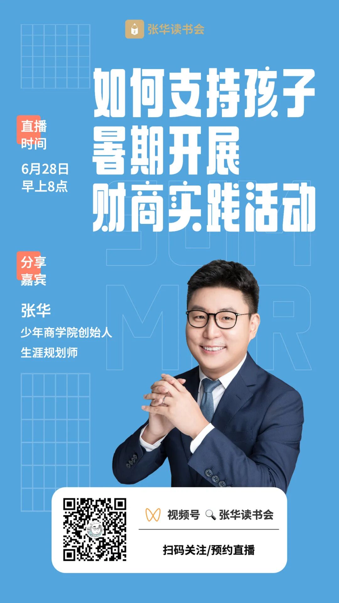 直播预约|明天(6月28日)早上8:00,少年商学院创始人张华老师将与大家分享:「如何支持孩子暑期开展财商实践活动?」,点击下方预约按钮即可预约直播!欢迎各位家长参与连麦!