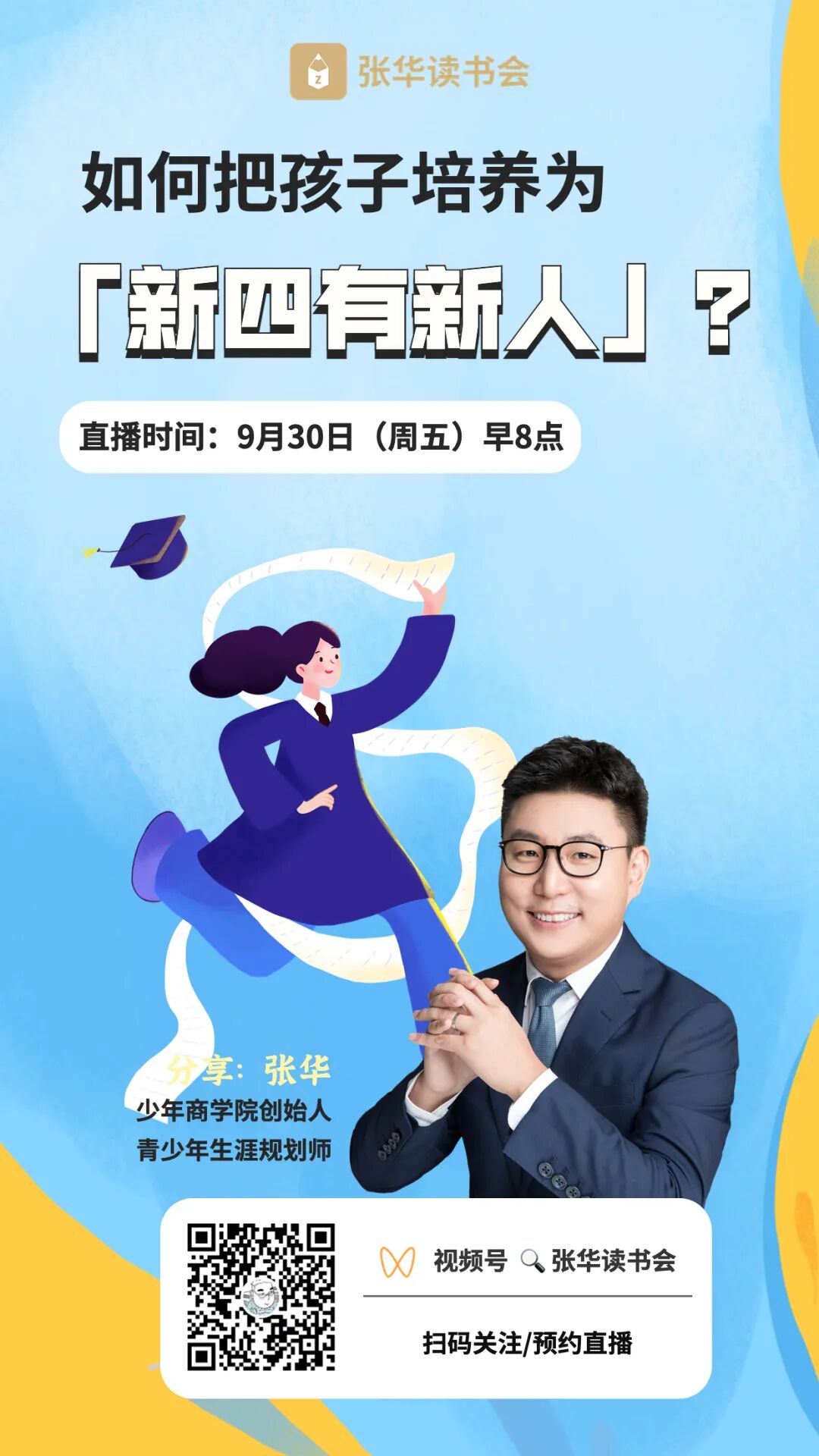 用他妈妈的话来说,就是豆豆这个人啊,思想力超过同龄人,学习力也超过同龄人。这都是因为,他早早地便有了自我意识。他读初中时,凡我批评应试教育,便开心得不得了。读了高中,就不再对我随声附和,而有了自己的主见。虽然我因为失去了侄儿这个超级拥趸而颇有点失落,但我更高兴的是,这个侄儿,他有了自我,他建立了用以评判事物的独立的尺度。我私下里较为乐观地认为,这一代新人,将是自我的,是彻底的个人主义的。他们的使命,乃在于,彻彻底底、完完全全,为自己而活,而非为了任何外在的事物。我们的孩子为什么不再刻苦了?因为刻苦没用了。而我们这一代父母老师,当下真正的使命在于,我们迫切需要改变自己的教育观,引导孩子们去享受他们所享受的那些物事。只有在他们自己感兴趣的事物上,他们才会将最为宝贵的思辨力、专注力、学习力、创造力投入其中。迟早有一天,他们也将会这样充满激情的,去建构他们的生活,重塑属于他们的世界。直播预约 | 9月30日(周五)早上8:00,少年商学院创始人张华老师将与大家分享「如何把孩子培养为“新四有新人”?」,干货满满。点击下方「预约」按钮即可预约,准时观看!