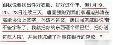 之后到了1990年,唐国强三次登门逼迫威胁孙涛签字离婚,“若不签字私了,我就把你东西砸个稀巴烂,把你送进疯人院。”