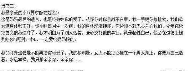 “你爸把善良的我遗弃了,我才明白为别人而活,全心支持他的事业,就是牺牲自己。他会在道德上被判处死刑。小L,你一定要给妈妈报仇,我的终身遗憾是不能再给你母爱了,我的教训是,女人不能把心栓到一个男人身上,你要为自己活着”
