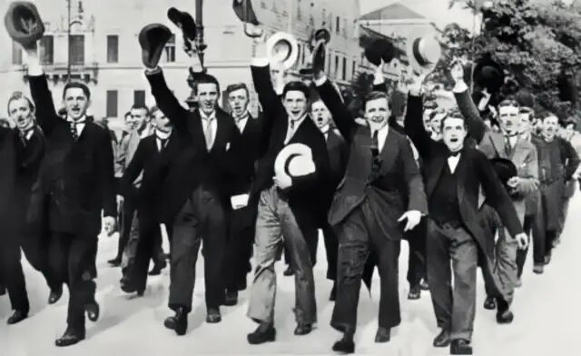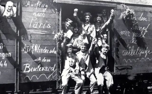 战争被宣布的时候,是在夏日的八月。欧洲几乎是一片狂欢,就像迎来了盛大的节日。在维也纳,人群兴奋狂喜,容光焕发,到处是音乐,到处是旗帜,一直庆祝到了深夜。著名作家茨威格是反战的,可就连他都心醉神迷了,也加入了庆祝的人群。他说那一刻他充满了激情。在巴黎,人群也在欢呼。成千上万的人围在林荫道上,喊叫着“打到柏林去!”人们热泪盈眶,自豪不已。在柏林,人们也在激动地大喊大叫,说要于叶落之前胜利凯旋。德国人唯一忧虑的是盟友太少了。不知道为什么,没有人喜欢德国。有人喊起来:日本加入我们了!大家抱在一起,发出欢呼。人流涌向日本大使馆,在那里高喊“日本万岁!”日本大使尴尬地出来挥手。没过三个礼拜,日本向德国宣战了。是啊,没人喜欢我们。可没关系,我们还是能赢!!!在伦敦,在莫斯科,在布鲁塞尔,在贝尔格莱德,情形几乎都是一样。![]()
