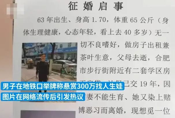 近期,安徽合肥,有位姓万的60岁老先生举牌称“悬赏300万找人生娃”。