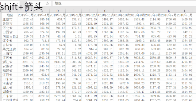 shift+箭头是一行一列的逐条选择连续的区域。