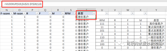RFM的值与对应的客户类型如下所示,用vlookup函数进行匹配就可以得到每一个用户的细分类型。