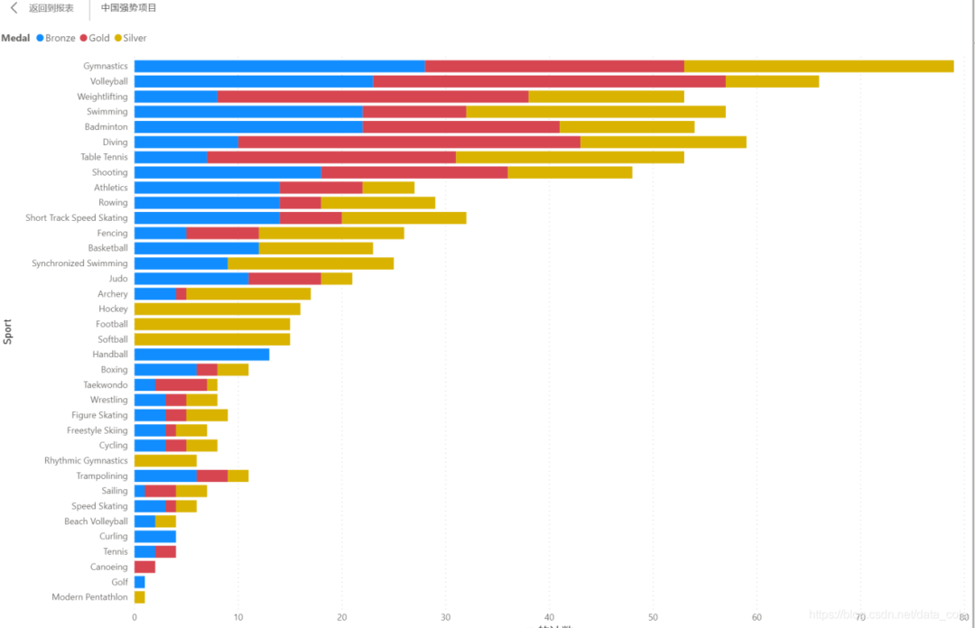 我国拿奖牌最多的比赛项目是体操(60块奖牌),其次是排球、举重、游泳、羽毛球、跳水、乒乓球。