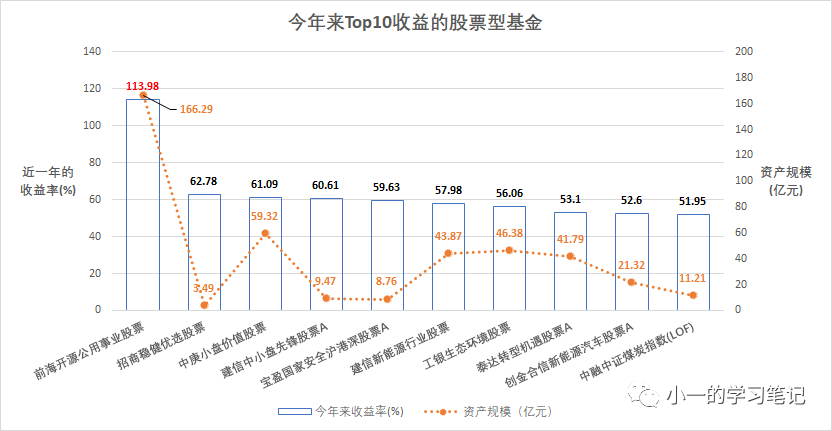 股票型基金今年来收益率的最高是 113.98%,Top10 的平均收益是 62.98%