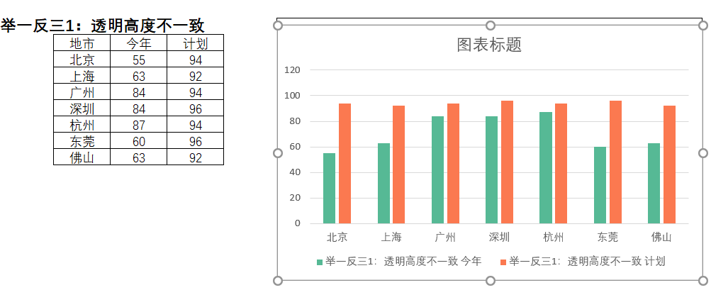 以上两种方法都是柱形图的透明部分高度是一致的,比如一份数据有实际执行情况和目标计划情况,目标都是不一样的,这种就需要柱形图的透明部分高度不一致。