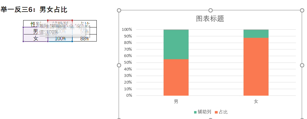 由上面这个男女占比柱形图的案例也可联想到男女占比条形图,关键在于层叠的设置。