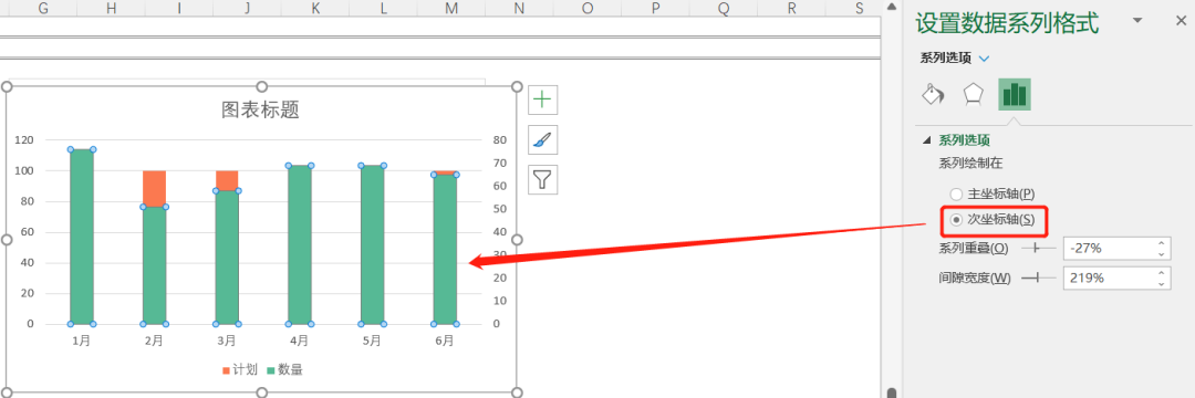 step2:通过设置次坐标轴的方法让图表变成透明柱形图的样式(这里重复的步骤不再赘述)