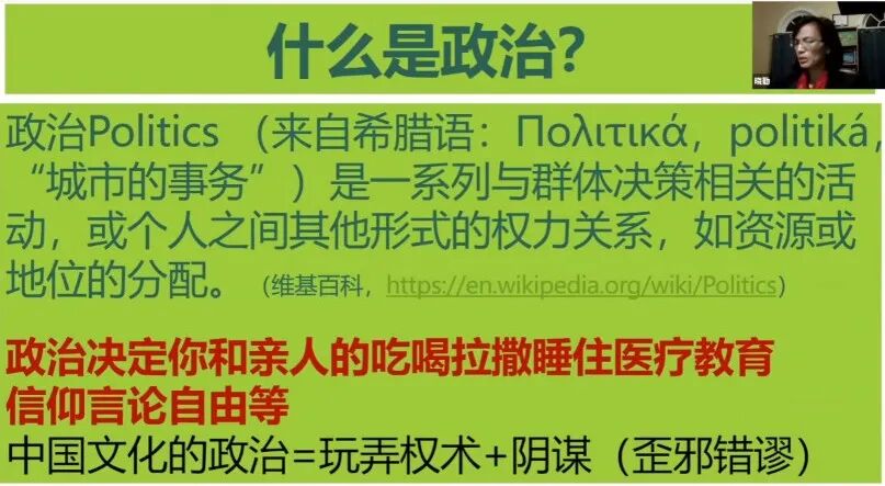 讲座视频链接: https://m.youtube.com/watch?t=301s&v=hjtGK8ogtz8 政治,politics,起源于希腊语,polis是城市的意思,一群人聚在一起讨论互相的权利关系,比如资源分配等等,这就是政治,与中国人认为的政治就是权术和阴谋不同,政治的本意与人的衣食住行方方面面密切相关。