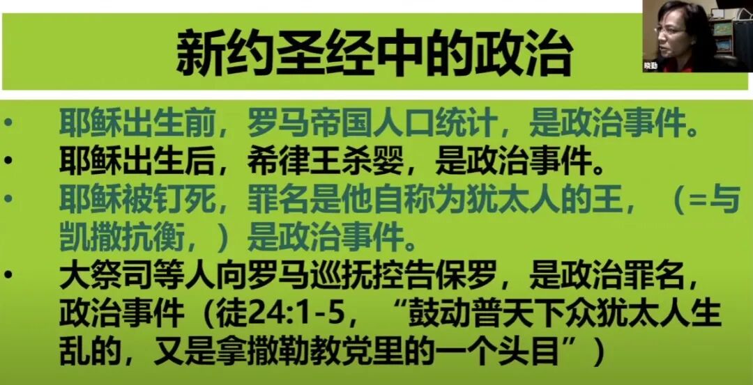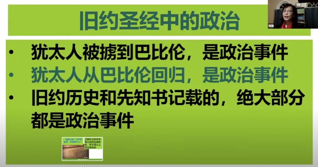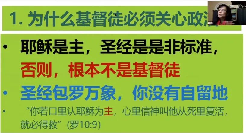 很多基督徒说基督徒不应该关心政治,但当我们打开圣经,分明可以看见圣经中几乎无处不政治,如果把圣经中关于政治的内容全部去掉,那几乎没有没剩下多少东西可以读了。 旧约中以色列民被掳到埃及为奴是政治事件;摩西跟法老对抗,带领以色列人出埃及是政治事件;以色列人进迦南地跟迦南人打仗是政治事件;先知撒母耳膏立扫罗王,扫罗王带领以色列人对抗邻国是政治事件;犹太人被掳到巴比伦是政治事件;可以说旧约中,除了约伯记以外,其他的所有的书卷都在讲政治事件,所以真的可以把政治从基督信仰中去掉吗? 再看新约,耶稣出生时,希律王动员全国力量杀死所有两岁以下的婴儿是政治事件;后耶稣被以“犹太人的王”这个莫须有的罪钉死在十字架上是政治事件;犹太大祭司向罗马官员以煽动暴乱罪控告使徒保罗是政治事件; 罗马书第13章说政府的责任是刑罚作恶,维护公义;施洗约翰批评希律王不应该跟弟媳妇搞婚外情而被砍头,对此耶稣并没有批评约翰多管闲事,而是说他比旧约所有的先知都更加伟大。 还有基督徒说我们应该关心天国,不应该关心地上的事。那么请问这些人为什么要带自己孩子去上学、补习班、考大学?这些不是地上的事吗?为什么让别人不要关心地上那方面的事,自己却去关心地上这方面的事,这种以自己的标准为标准的人,他的主不是耶稣基督,而是自己。如果说我就不关心地上的事,那么就应该用同样的标准用在自己生活的方方面面,圣经上说两样的砝码,两样的升斗都为耶和华上帝所憎恶。 申命记六章4~9节:你要尽心、尽性、尽力爱耶和华你的神。我今日所吩咐你的话都要记在心上,也要殷勤教训你的儿女。无论你坐在家里,行在路上,躺下,起来,都要谈论。也要系在手上为记号,戴在额上为经文。又要写在你房屋的门框上,并你的城门上。 新旧约中跟“城门”有关的章节一共有几十处,“城门”指的是相当于现在的政府、法院、公共平台。也就是说基督徒既要扎根真道认识上帝-尽心爱主-保守心田-爱上帝并爱人如己-教导儿女真道-见证基督,也要做世上的光、山上的城,去影响更多的人。 现在美国很多州学区的政策是,小区和学校并不是固定对应的,而是由政府来决定你的孩子在那个学校上学,接受什么样的教育。到学校后老师又把变性变态的东西灌输给孩子,告诉你的孩子,两个男人也可以组成一个家庭,两个男人一个女人也可以组成一个家庭,两个女人一个男人还可以组成一个家庭,拼命地塑造孩子的价值观人生观。 还有一些州小孩12岁跟别人发生性关系得了性病或者要堕胎,父母竟然没有权利知道,所有这些都是政治决定。你不关心政治,政治却每时每刻都在关心你。 很多年来,政教分离原则在美国被误解和滥用,美国国父们的本意是让政府不要干涉教会,而不是让上帝离开政府。这种分离是单向的,因为政府需要有善恶是非标准,如果没有上帝,哪里来的稳定标准? 宪法第一修正案如下,国会不得制定任何有关宗教信仰或禁止其自由行使的法律或剥夺言论自由和新闻自由,或剥夺人民和平集会的权利和向政府请愿申诉的权利。第一修正案保护言论、宗教、新闻集会和请愿自由。