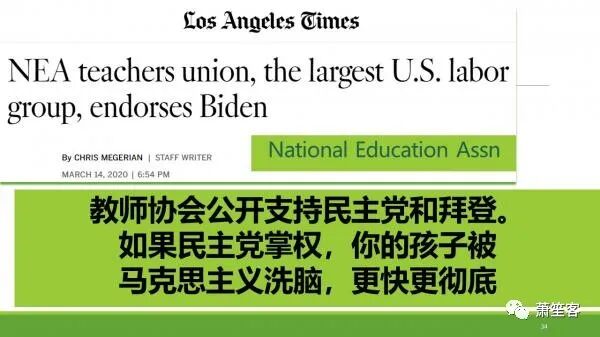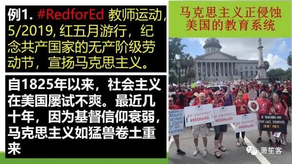 上面是这两党的政策的对比,可以看到清楚哪一个党是维护公义,奖善罚恶的: 共和党反对堕胎,反对用拿纳税人的钱堕胎,民主党而支持用纳税人的钱堕胎,包括 Late turn堕胎,这种堕胎是如果孩子生下来是可以活的。最近死的大法官鲁思·巴德尔·金斯伯格就是支持这种堕胎,这种堕胎是你的孩子马上就要生了,但如果妈妈不想要这个孩子,就用仪仪器伸到肚子里把孩子的头给剁下来,然后把身体肢解一点点把它吸出来。这种孩子生下来都是可以活的。他在上帝面前是人,有人权,没有犯罪,为什么要给他判死刑,还惨无人道的这样害他?"十戒"之中,有一戒就是不许杀人,包括杀肚子里面的孩子。 婚姻破坏家庭,共和党的纲领里面,非常清楚支持两性婚姻,就是圣经上的一男一女的婚姻。 民主党前一段时间在脸书上列出了56种不同的性别,太可怕了,想一想,如果你才7岁的女儿在学校上学,你敢让一个五大三粗的男人,突然觉得自己现在是个女人了,跑到女厕所里面,跟你的7岁的女孩一起上厕所吗?这是严重违背圣经教导,如果你是基督徒,你还支持这样的党,你就不怕上帝的愤怒吗? 马克思是马克思主义的代表,它诞生在基督教开始衰弱的時代,它不是诞生在中国,因为中国这个地方是诞生不了马克思主义这样的思想的。世界上所有的奇奇怪怪的的主义,都是诞生在基督信仰衰弱的地方。 有个教授最近做了统计,马克思主义是基督信仰以外,人类思想中最被推崇广泛流传的主义。它里面有很多圣経里面的型式。很多从中国大陆来的人,在教堂观察怎么学习圣经,发现跟共产党小组学习很相似,这个观察其实非常正确,因为马克思主义是诞生在基督信仰为弱的地方,这地方的集体抵抗力变差了以后,马克斯主义就承机而入,所以它有很多外表的是基督信仰的形式,可以说是他把上帝赶出去,把人和人的组织放在上帝的皇座上。 由此它可以描绘出非常美的图画,如乌托邦那就像天堂一样的东西。 马克思主义思想一直在美国上空弥漫着。以前美国基督信仰根基很牢固,人们对神认识很扎实,它就像外面就像细菌一样,总在你的外面环绕着,它就进不来。但现在基督信仰越来越薄弱。就给这个细菌进入的机会。共和党也有一些这样的人,但远远没有民主党的这么严重。 美国有个教师运动叫Red for Ed ,也就是红色教育,这是2019年5月他们的5月游行,五一劳动节是共产党的节日,是全世界无产阶级团结起来的一个宣告,中国的五一劳动节也是从西方流传过来的。 美国教师是被自由派马克思想侵蝕最严重的,很多保守派的基督徒发现你们的儿女背弃你们的信仰,背弃你们从小在家给他们的教养,这是因为很多美国教师严重被马克思主义的思想侵蚀,被这种思想限制,你们的孩子受他们的教育,就会变成这样。