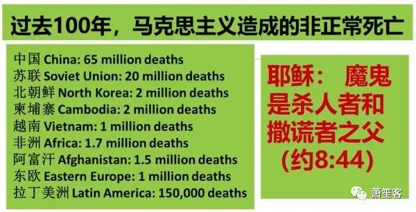 我有一位朋友都60多岁了,他们是被自己的父母放在这种环境中养大的,这些人很多都有严重的心理问题,除非他们后来被主耶稣改变了。我几年前去以色列,发现以色列早些年也搞这个社会主义,也有一批人这样长大,后来他们意识到这个问题的严重性,绝大部分妈妈都选择自己养自己的孩子,因为你的孩子只有你最爱他,你最了解他,你最关心他的未来。 资本主义是有圣经依据的,十诫其中一诫就是不要偷窃,另外一诫就是不要贪婪人家的东西,资本主义其实就是圣经旧约所说的,要保护人的私有财产,摩西五经里面讲得很清楚。 保护私有财产是资本主义的根基,也是发展科技的原生动力,为什么中国的基础科学和高科技很难发展出来?其实中国人不笨,还是挺聪明的,就是因为中国不保护私人财产,很多中国人稍微有点钱他就移民了,因为他担心他的财产被没收了。 保护私人财产,是圣经的教导,保护私人财产就是资本主义的基础,也是社会科技发展的动力,人们愿意投资,愿意为了将来的动力,如果没有私人财产保护,他做的这些东西,最后不知道为谁做的,他为什么要做呢? 黑人命贵也要废除大学择优录取的方式,要根据肤色来录取。这就象马克思主义一样。马克思主义就是要人为地把人分成不同的阶级,但如果你稍微了解近代经济学家看法,你就会发现经济不同的阶级,在美国流动性很大的,如果你很努力很勤奋,很认真学习,愿意做自我牺牲愿意投资,那么你即使很穷,你也可以变成一个很有钱的人。所以人为的把人分成阶级是不对的。 在上帝眼中,只有得救的人和不得救的人,上帝是按照人的品格来评判人,不是按照你的经济情况,所以马克斯主义把人故意的分成阶级,分成阶级以后呢,他就挑拨阶级之间的矛盾,从中得利。 他们还要用各种各样的办法,去摧毁社会现有的社会结构,也就是原子家庭,原子家庭是任何一个社会稳定的,最基本的,最必要元素,你把它摧毁了,整个社会就完蛋了。 第二,给你一个最低工资,你一个小时必须出15块钱,但是如果他受的教育不好,雇主觉得一小时付他15块钱很不划算,就不会让他上班,他没有工作了,就要政府出钱来养,但是政府不赚钱,政府就要其他人的拿钱出养他们,这样就等于把整个经济都搞袴了。 既然政府把你养着,你为什么还需要工作?你为什么需要父亲呢?这就为什么75%的黑人出生在没有父亲的家庭,这比他们以前做奴隶的时候还要糟糕。 现在有些黑人已经慢慢的开始看见这个东西,2016年,我听说只有8%的黑人支持共和党,但现在越来越多黑人支持共和党了,就是说民主党不是在爱他们,是在害他们,就用一点点钱,像让你吸毒一样,把你套上了,结果你就出不来努力了。 我讲一下马克思主义,中国说马克思主义是无神论,其实它从来不是,因为马克斯主义在信仰衰弱的环境长大的,马克思是个犹太人,他的爸爸是个犹太教徒,为了做生意,在欧洲为了拉拢基督徒买他的东西,他就说他变成基督徒了。 马克思自己是个撒旦教徒,撒旦教也是在基督教的土壤里面长出来的,他读了圣经了解了圣经,但他不想跟随上帝,他觉得跟着那个魔鬼比较好玩,可以得到急功近利的东西,所以马克思是一个撒旦教教徒。马克思写过很多诗,在他的诗中,说他把他的灵魂卖给魔鬼,他愿意下地狱。所以马克思不是无神论者,是撒旦教徒是魔鬼。撒旦就是最大的一个魔鬼的名字。马克思的诗就充满了这种像魔鬼一样的东西,就是欺骗和杀人。 这是圣经上说的。 你们是出于你们的父魔鬼,你们父的私欲你们偏要行。他从起初是杀人的,不守真理,因他心里没有真理。他说谎是出于自己;因他本来是说谎的,也是说谎之人的父。 上面的表列出100年马克思主义造成的非正常死亡的人数,也就是被谋杀,被判死刑,自杀,你被莫名其妙的,不是天灾而造成饥荒饿死了。比方说像中国1959年到61年,不是天灾是人祸造成的死了人数,其实这些数据都是保守的,这些国家死了人他们数据都藏起来了。这是后来人估计的,中国死亡6,500万,苏联2,000万,柬埔寨死了200万,相当于柬埔寨1/4的人口,越南了死了100万,非洲死了170万,阿富汗死了150万,这都是死于马克思主义啊,东欧死了100万,拉丁美洲死了15万,所以你还希望马克思主义继续在美国吗? 美国现在其实是有两个问题,第一个是基督信仰削弱,也就是说自己的免疫力差了,然后马克思主义才趁虚而入。从1825年开始,马克思主义就开始在美国的上徘徊,只不过是屡试不爽,现在美国的这基督信仰衰落,这个马克思主义这个细菌就开始入侵身体了。如果细菌进入身体怎么办?第一要增强免疫力,也就是基督徒要回归圣经真理。第二是如果细菌太多了,你的抵抗力也很差。那么我们要吃抗生素,我们这些基督徒我们要坚决抵制马克思主义,这个幽灵在美国上空的盘旋,在民主党中的侵蚀中表现得非常清楚。 很多人说,川普不完全也不清洁呀,我说是的,因为你也不完全,你也不清洁,美国也不完全,美国也不清洁了,这样的话,上帝当然不会用的完全的清洁的工具来对待你,那个工具不好用,因为现在美国乖僻的人太多了,上你就必须有弯曲的工具来对待他。 对付怪癖的人,就要用川普这种让你摸不着头脑,不知道他开口会说什么的人才好,因为如果你能够猜出他说话的话,这些怪癖的人就会去陷害他。这就是为什么上帝在美国历史这个时候,选择了川普,这是对美国的大怜悯
