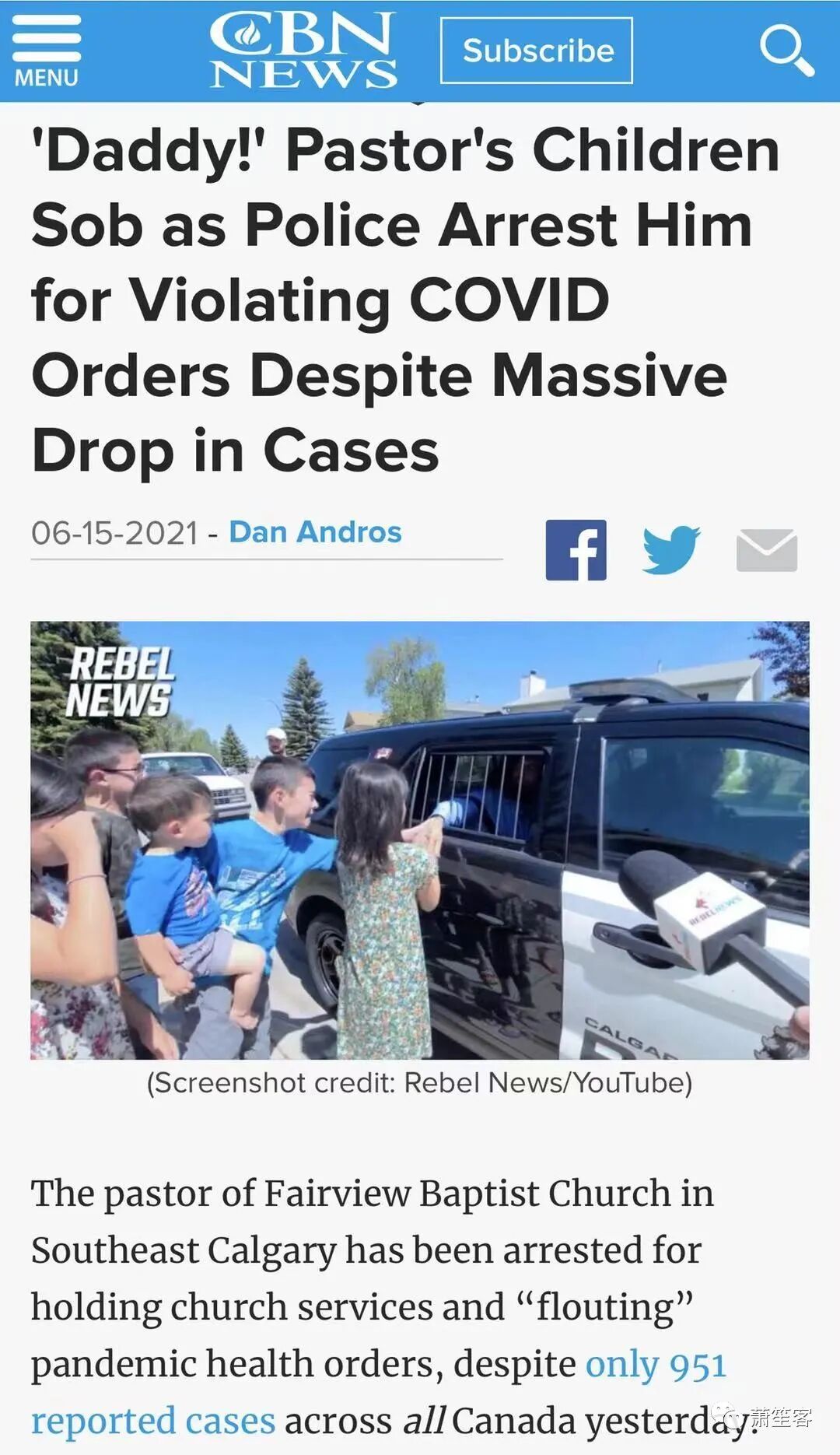 CBN的报道:尽管昨天全加拿大仅报告了 951 例病例,但卡尔加里东南部 Fairview Baptist Church 的牧师因举行教堂礼拜(150多名教友参加礼拜)和“无视”流行病卫生命令而被捕。昨天在互联网上流传着一段令人不安的镜头,斯蒂芬斯牧师被拖进警车,他惊恐的孩子们在一旁眼睁睁地看着,无法控制地抽泣。