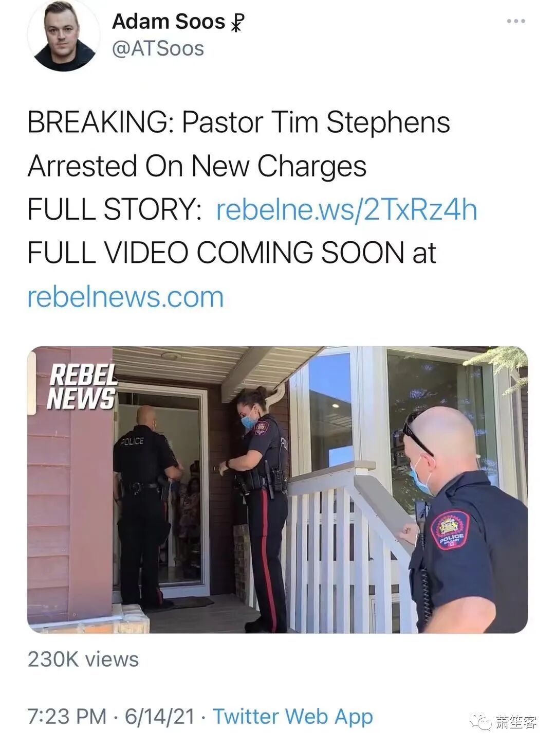 被捕的原因是 "在大流行期间,围绕礼拜仪式的公共卫生问题一直存在"。在围绕这次逮捕的媒体报道中,却不提及加拿大的COVID病例正在急剧下降的事实。根据人口普查局的最新数据,加拿大有3700万人,这意味着全加拿大只有0.0025%的人感染COVID。在COVID大流行期间和之后,加拿大对一些教会和牧师进行了无情的镇压,另一名科茨牧师被关了几个星期,在他最终获释后看到他的教会被围起来。他们和斯蒂芬斯牧师一样,转移到了地下聚会。