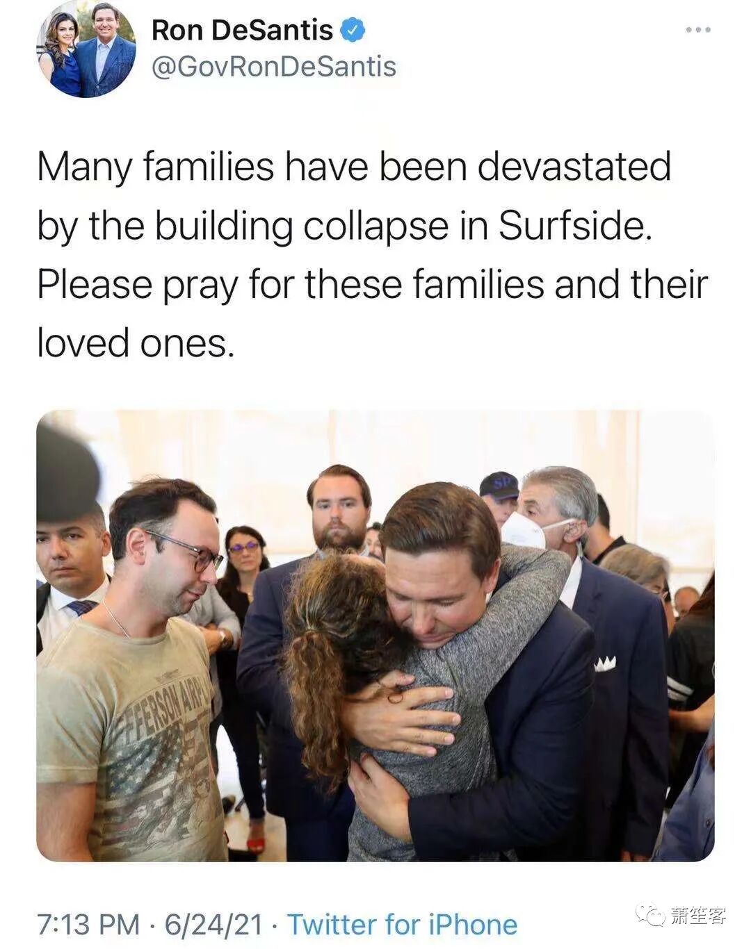 6月24日周四凌晨1时30分,佛州迈阿密瑟夫赛德附近的尚普兰塔南海滨大楼的一栋12层高的海景公寓突然倒塌,居民睡梦中被埋,截止6月25日上午,已经确定4人死亡,另外159名下落不明,死亡人数可能会上升。建于1981年130多套的此事故公寓,正进行顶部装修。一些是常年居住的,有些在冬季使用。(详见:监控拍下公寓楼倒塌瞬间 ) 德桑德斯州长于事故当日急速赶到现场,表示工程师已开始调查倒塌的原因。说:这是一个悲惨的日子!我们仍有希望找到更多的幸存者。 德桑德斯 的推特:许多家庭因瑟夫赛德 的公寓楼倒塌而受到打击。请为这些家庭和他们的亲人祈祷!