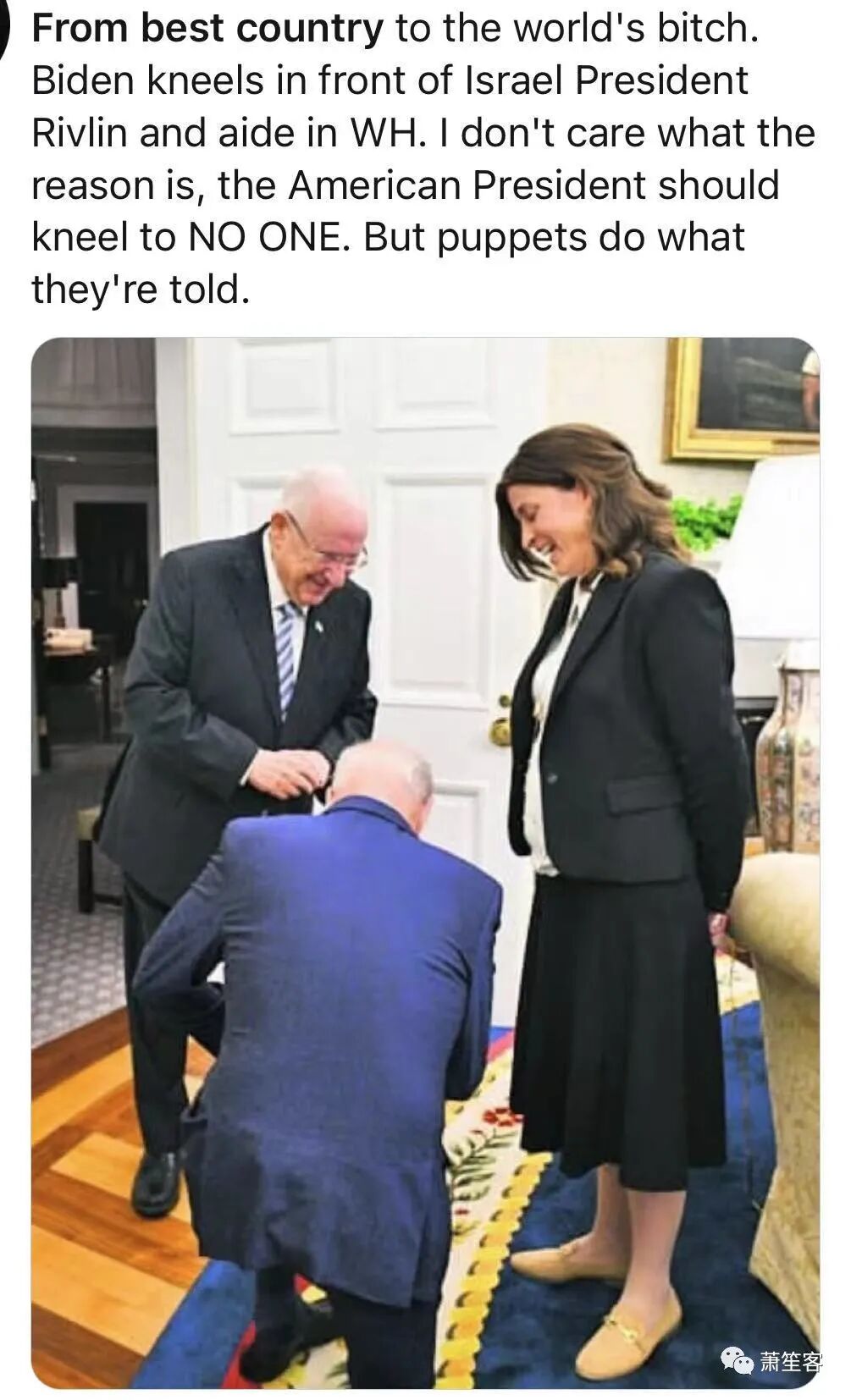推文:从最好的国家到世界的婊子。拜登在以色列总统里夫林和白宫助手面前下跪。我不在乎是什么原因,美国总统不应该向任何人下跪。但是傀儡都是听命行事。