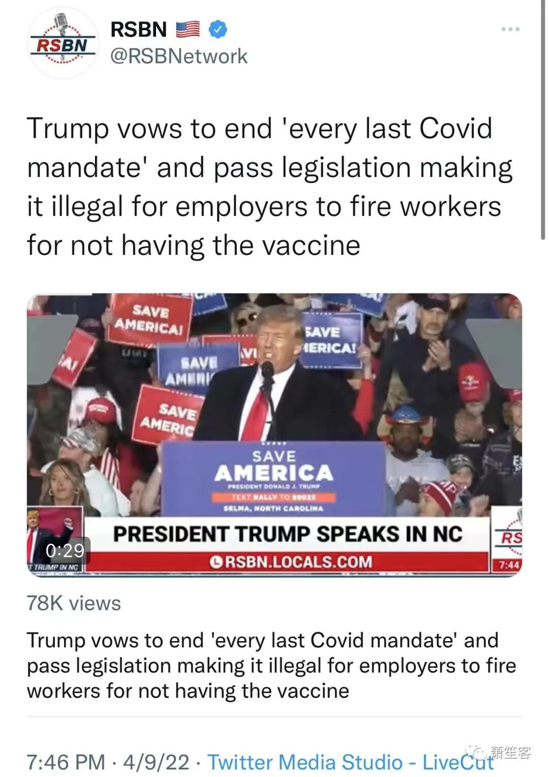 参见: https://www.breitbart.com/politics/2022/04/09/trump-wants-to-make-it-illegal-for-employers-to-fire-unvaccinated-workers/