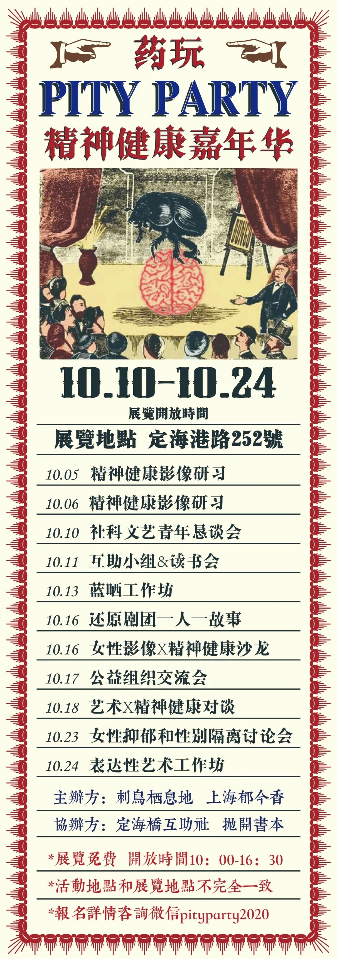 展览期间,除了现场能够看到实物的展品之外,我们还会办很多公共艺术活动,以及精神健康自助/互助活动,形式包括但不限于讲座、沙龙、工作坊,还有面向亲历者的读书会和互助团体等等。