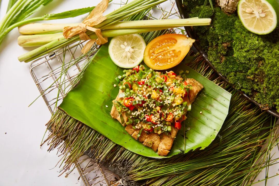 傣味包烧鲜排,香茅、柠檬、辣椒还有天然芭蕉叶包裹着大豆蛋白,一起烤制,味道浓郁。