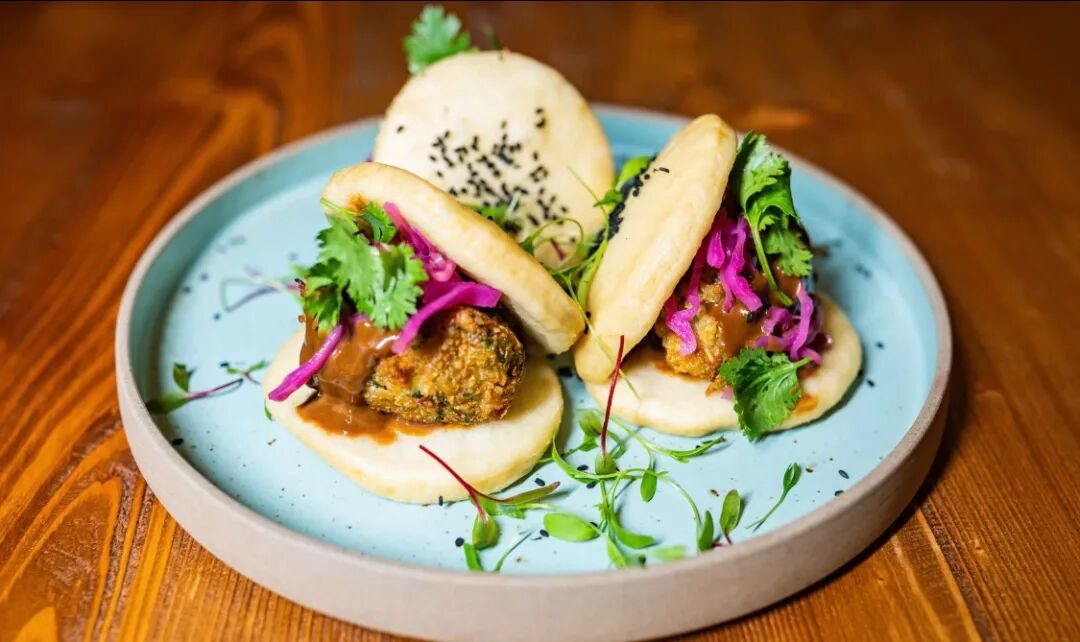 玉米花椰玲珑包,模仿的是台湾的刈包,用花椰菜和玉米做成的丸子,配上酱料和腌酸菜,一口咬下去很是幸福。